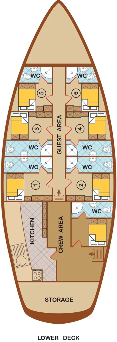 Yachtul are la bord un echipaj profesionist format din 3 persoane : capitan, steward/deck hand si chef.