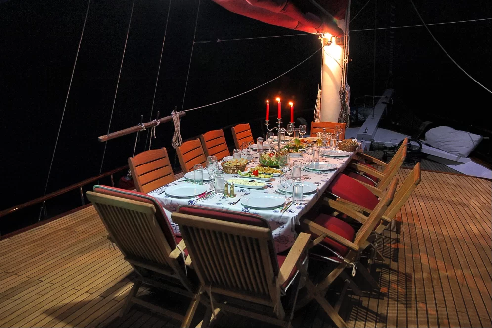 Vei avea un chef personal cu care poti stabili inainte ce mancaruri preferi si va gati special pentru tine. Stewardul se va ocupa sa fii servit asa cum iti place (mancarea va fi totdeauna calda si bautura rece). Capitanul va face tot posibilul sa te duca in cele mai frumoase locuri si va face tot posibilul sa-ti satisfaca toate cerintele.